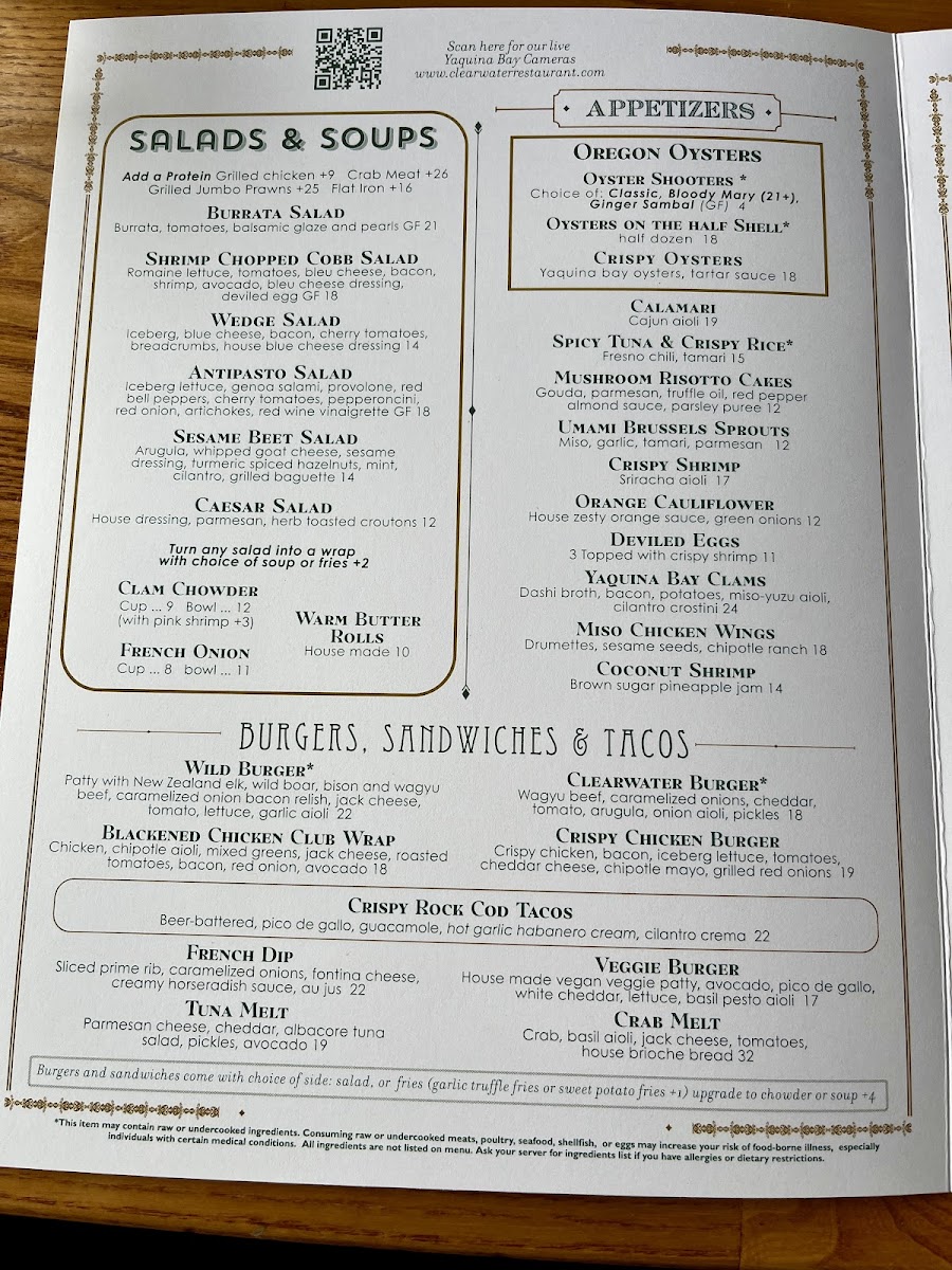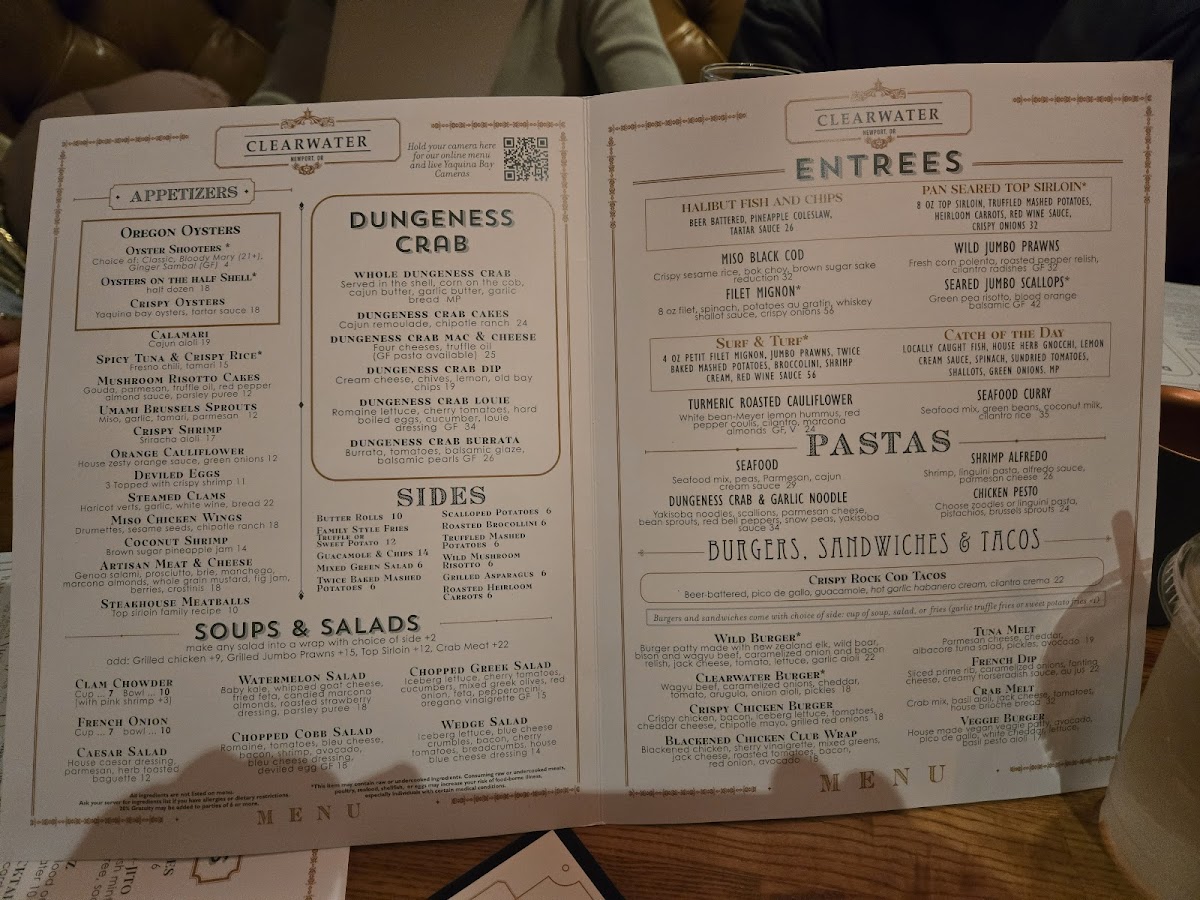 Appetizers and Light Bites: The menu offers various starters like Crispy Calamari, Steamed Clams, Oyster Shooters, and Clam Chowder. These items serve as light options or starters before main meals.