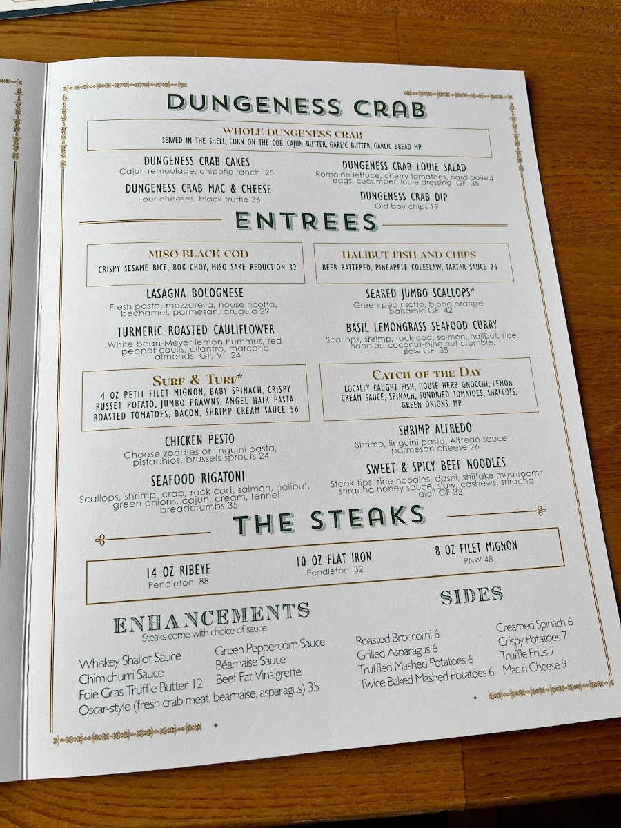 Main Courses: This section includes a range of seafood and meat dishes such as Basil Lemongrass Seafood Curry featuring scallops, shrimp, rock cod, salmon, and halibut, as well as the Beer Battered Crispy Rock Cod Tacos. Other notable main dishes include Halibut Fish and Chips, Local Whole Dungeness Crab, and Bison Burger, providing options for different preferences and dietary needs, including gluten-free selections.